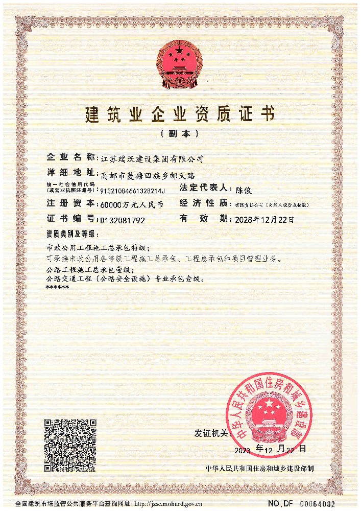 江蘇瑞沃建設(shè)集團(tuán)有限公司成立于2007年,是一家以市政、交通工程建設(shè)為主導(dǎo),集房屋建筑、交通安全設(shè)施、城市道路照明工程、電力工程、隧道工程、航道工程及投融資為一體的綜合性企業(yè)。企業(yè)注冊資本60000萬元,現(xiàn)有各類技術(shù)人員580人,其中中、高級以上人員498人,注冊類人員268人,一、二級建造師166人。公司榮獲“江蘇省建筑業(yè)優(yōu)秀企業(yè)”、“江蘇省五一勞動獎狀”,連續(xù)多年被評為“揚州市先進(jìn)企業(yè)”、“江蘇省建筑業(yè)百強(qiáng)企業(yè)”,連續(xù)八年蟬聯(lián)百強(qiáng)企業(yè)基礎(chǔ)設(shè)施類第一名。